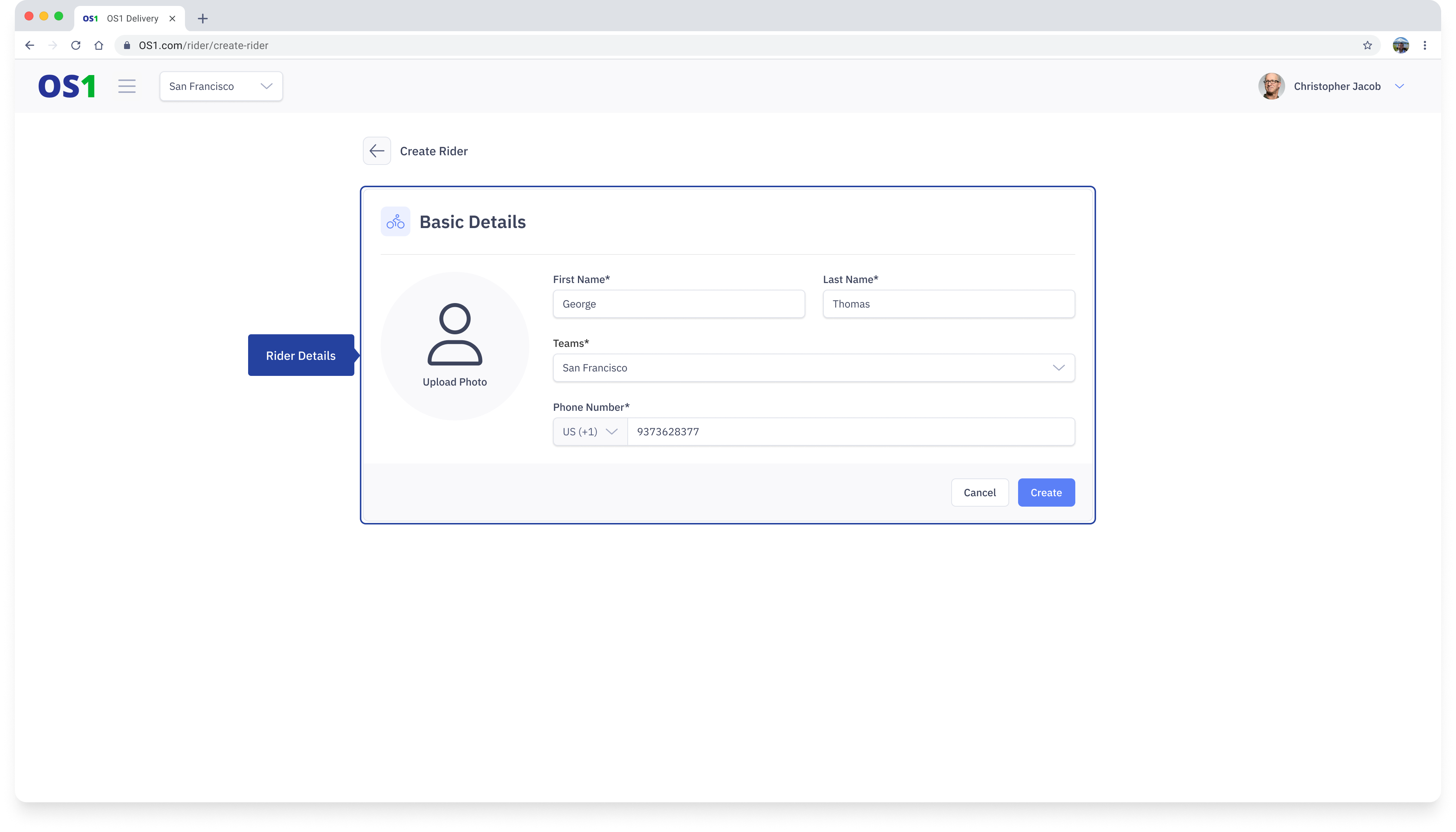 To create a rider on DispatchOne, navigate to the Riders page and click on the "Create Rider" button located in the top right corner of the page. This will take you to the Create Rider, where you need to enter the following information:
