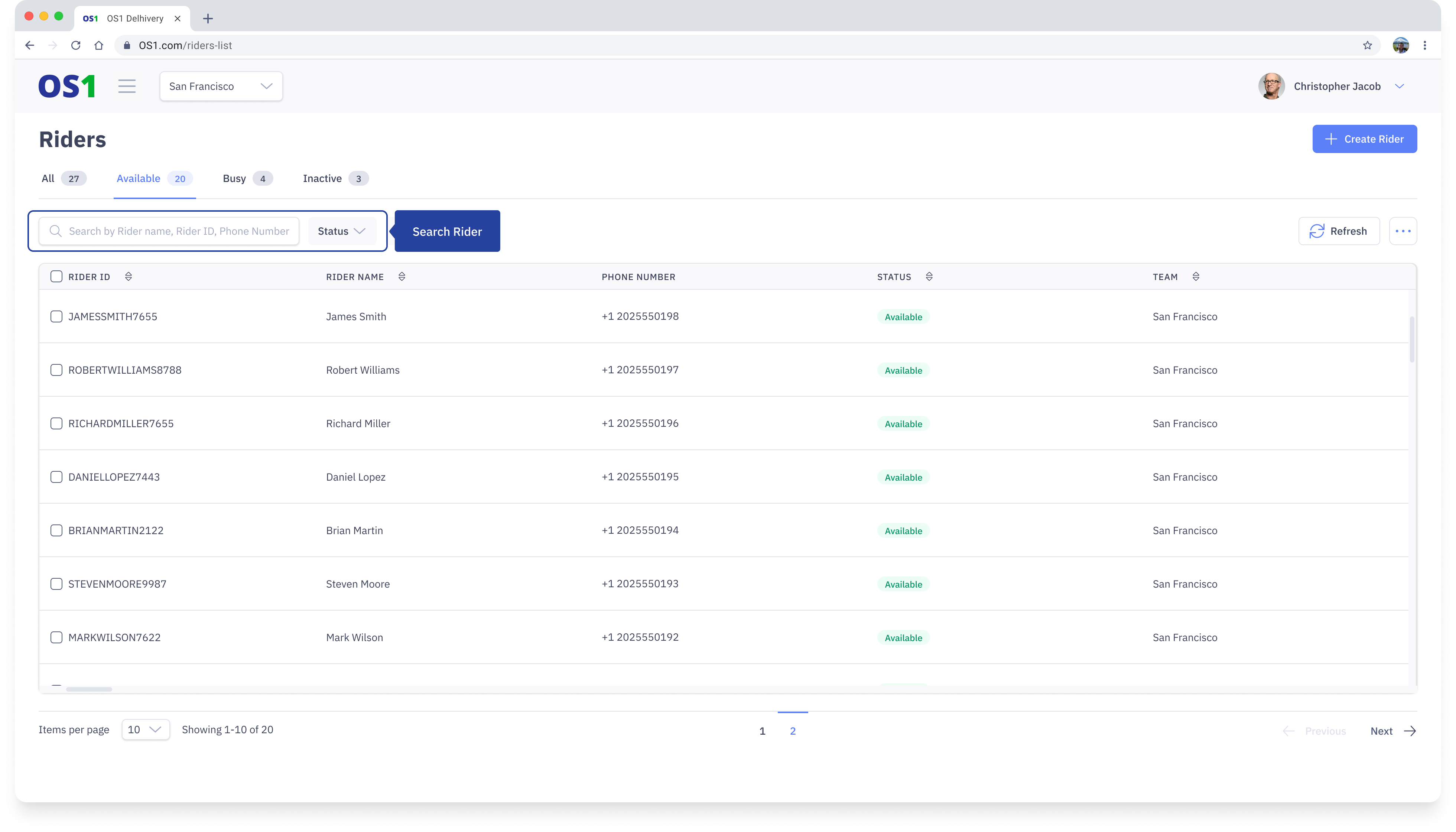 To search for a Rider, enter the Rider ID, Rider Name, or Rider Phone Number in the search bar on the Rider Listing page.