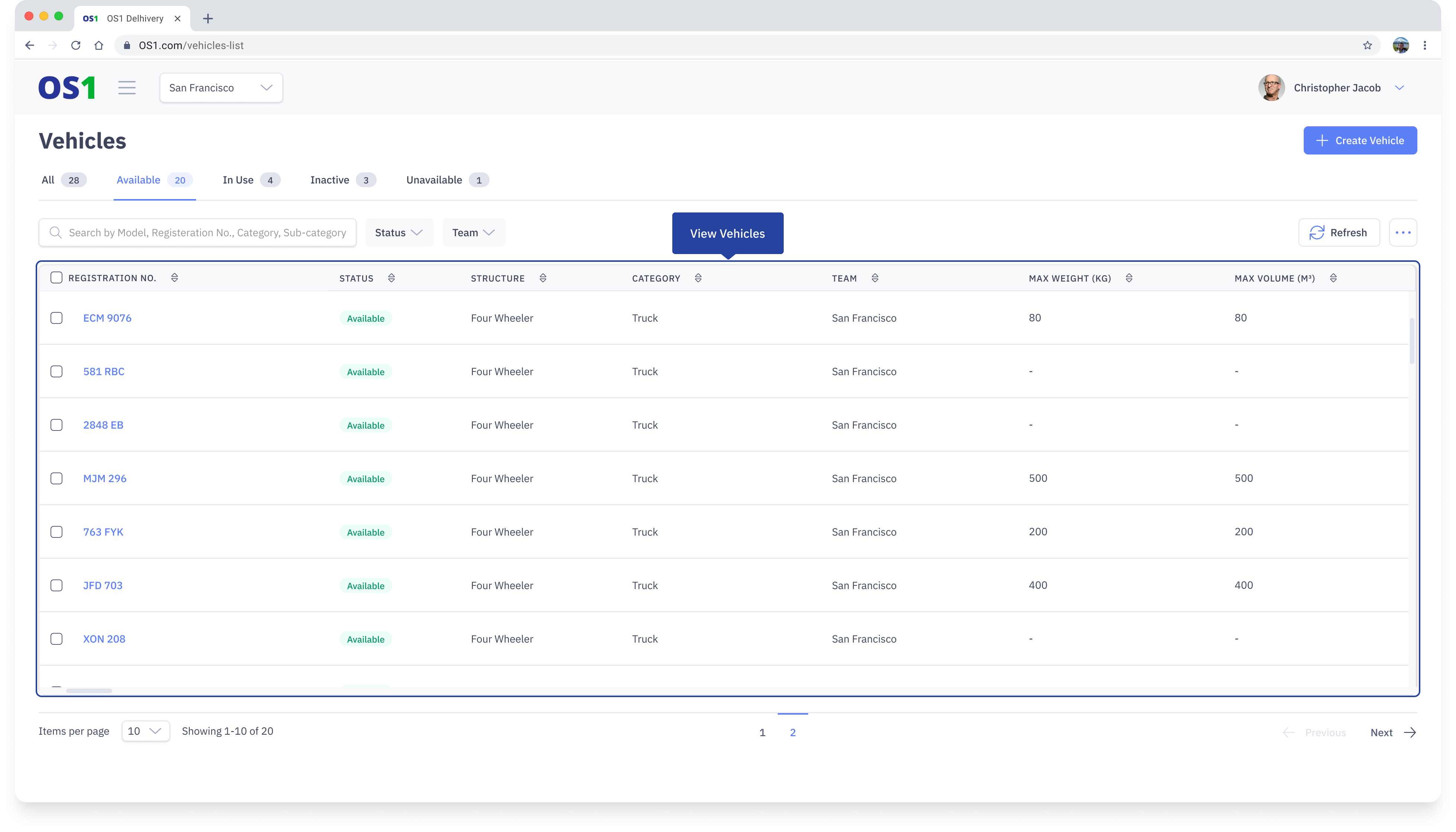 Once you have created a Vehicle, you can see the list of all the created Vehicles on the Vehicles Listing page. You can see the following information about each vehicle in the table:
