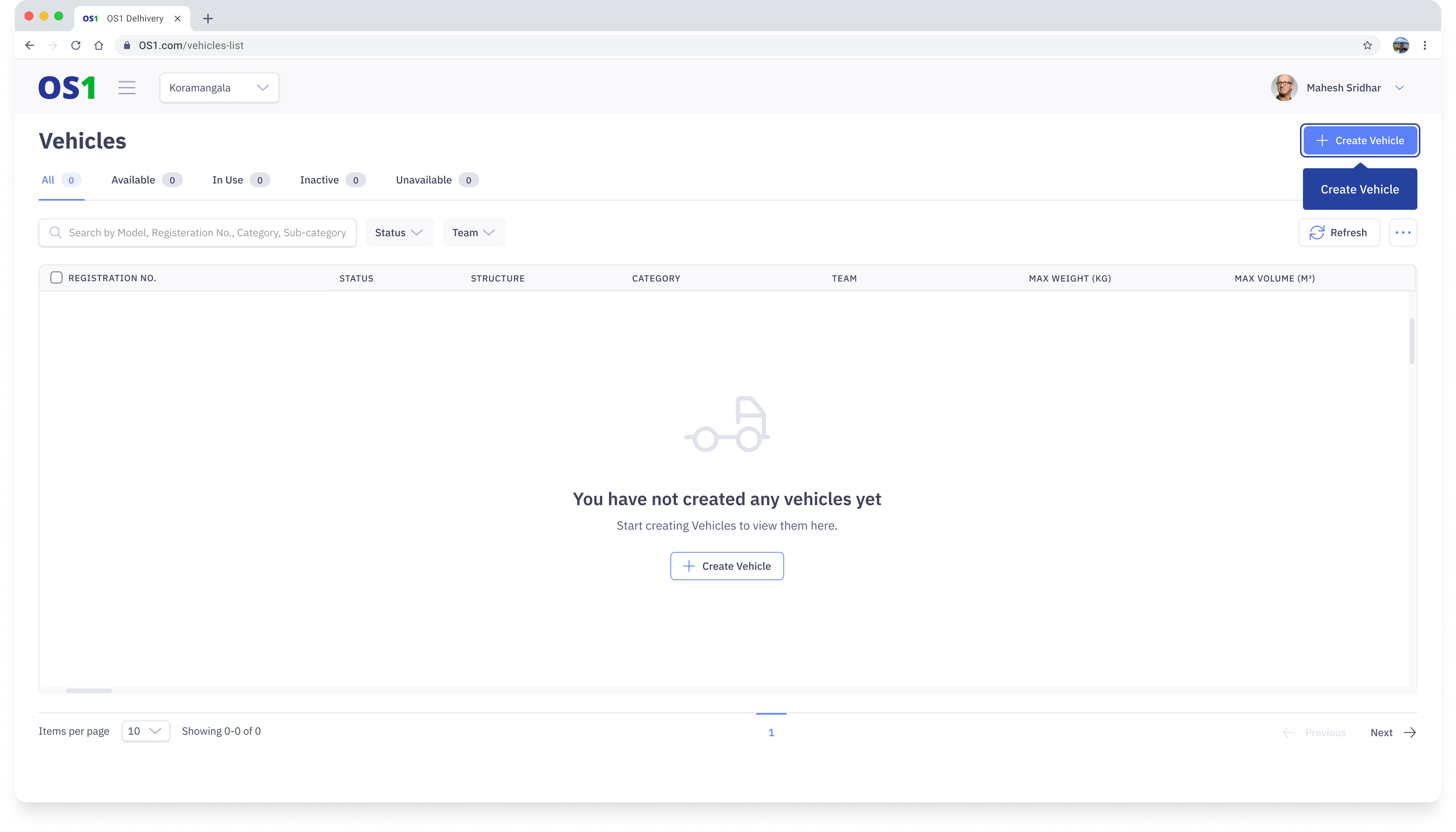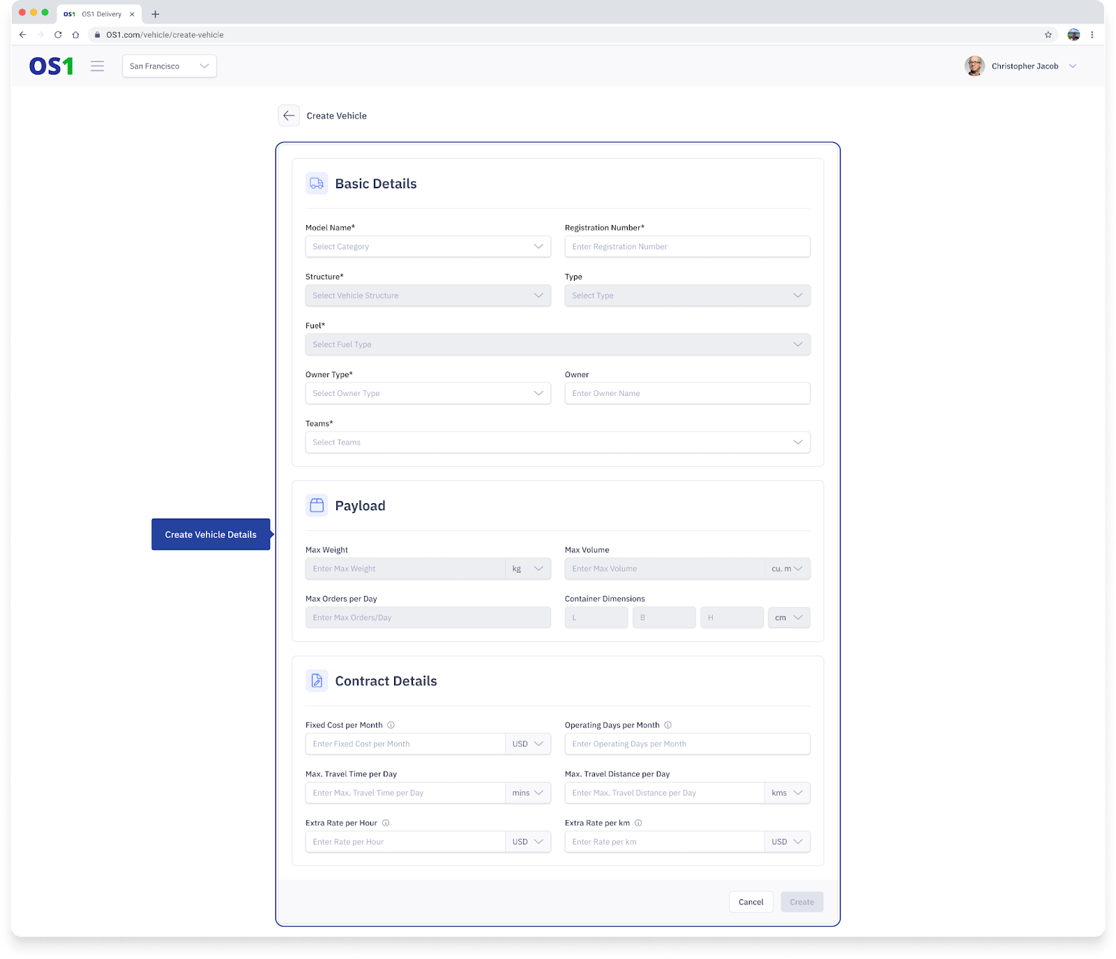 To create a Vehicle in the system, navigate to the Vehicles page and click on the "Create Vehicle" button located in the top right corner of the page. This will take you to the Create Vehicle page, where you need to enter the following information: