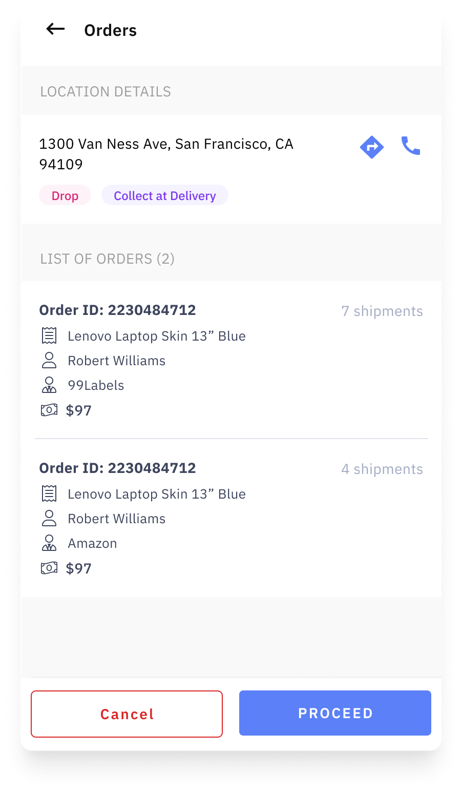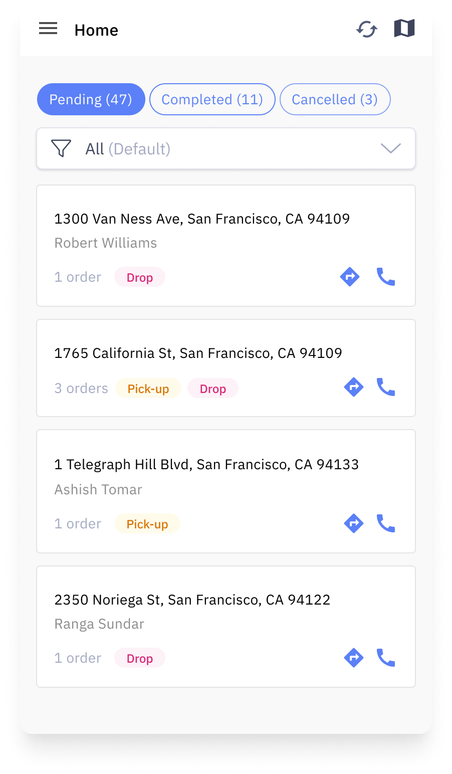 - Here, the driver can see a list of locations which the driver needs to visit. Each card represents one location, and displays the following information: