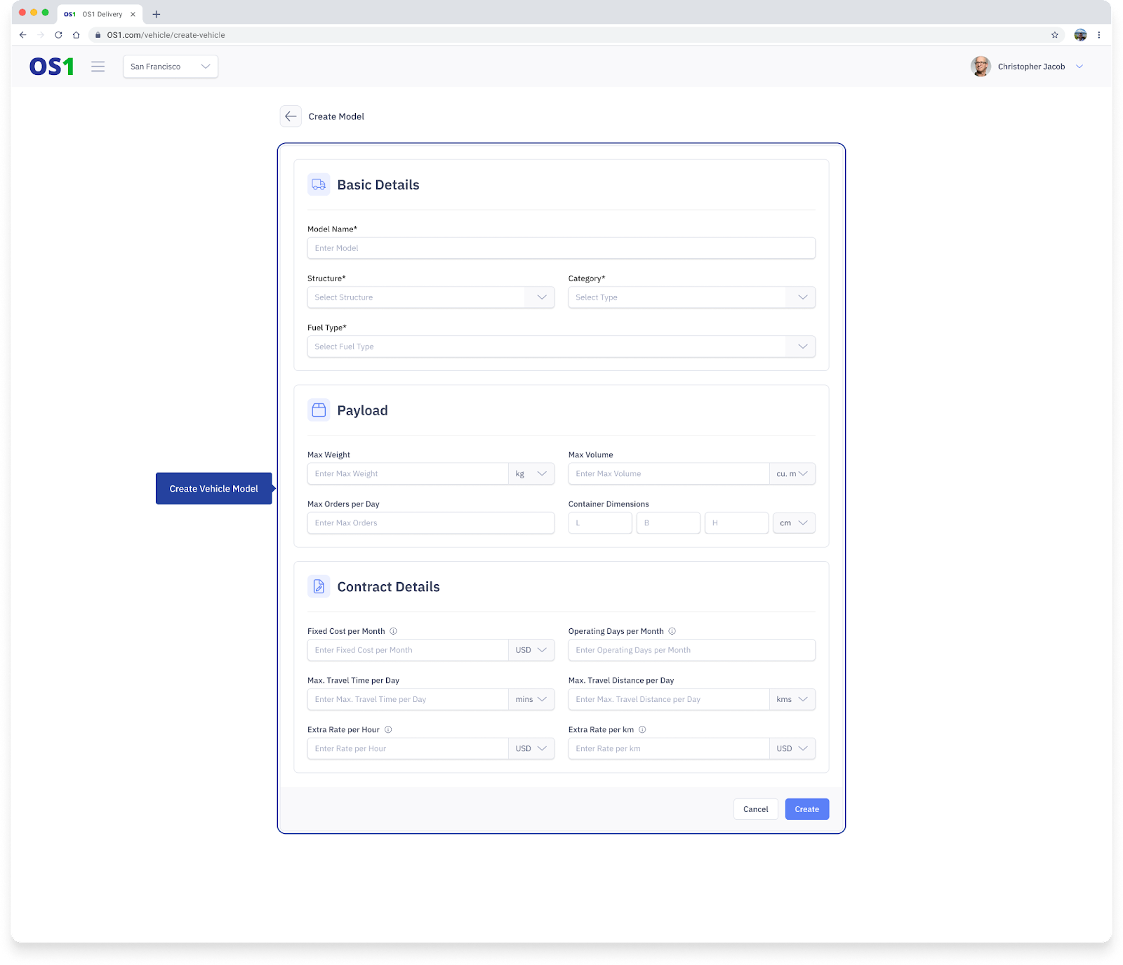 - Fixed cost per month: This field captures the total fixed cost for a month for the vehicle associated with this vehicle model. This cost is further used to identify the right vehicles to be dispatched ensuring lower overall costs.