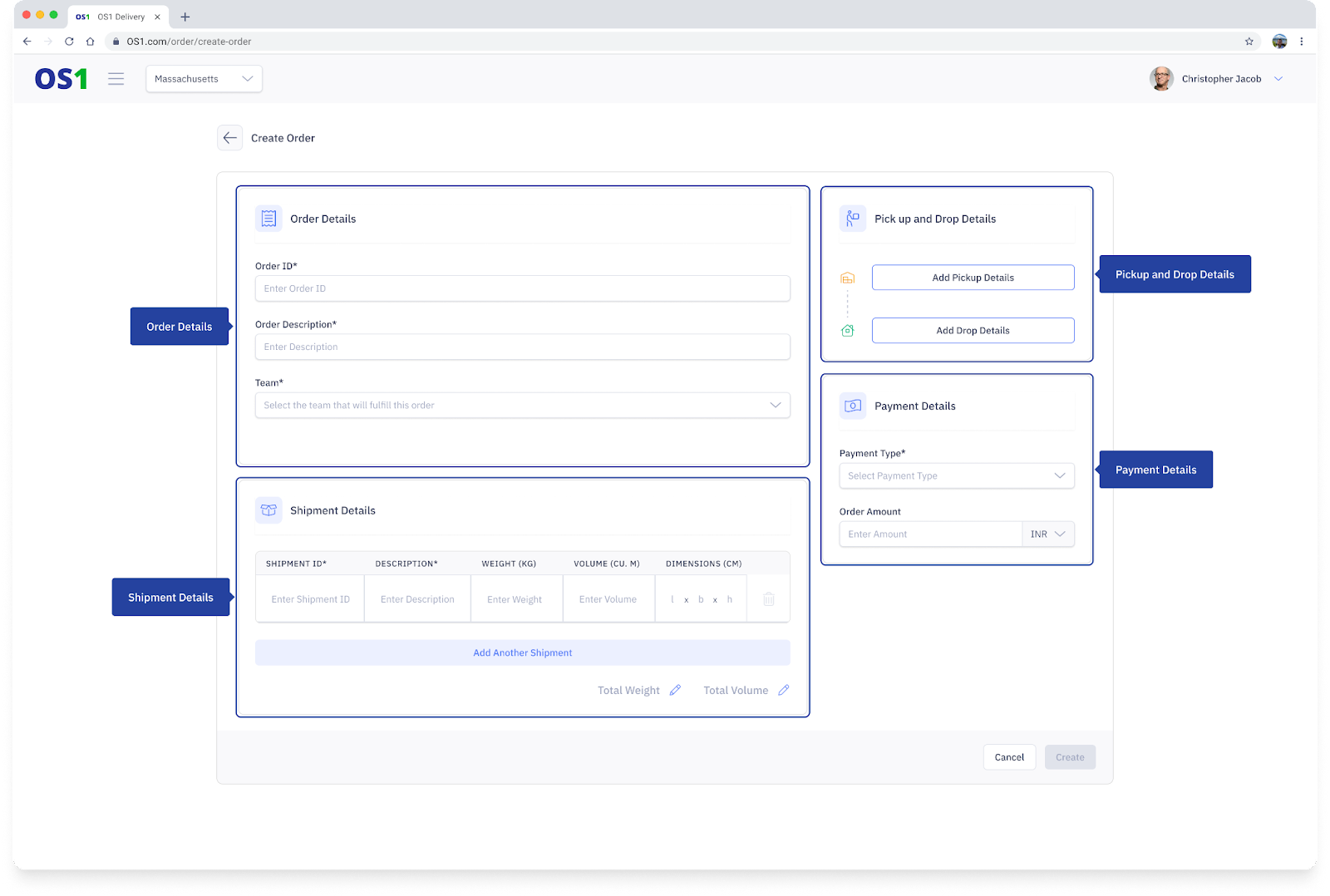 Once you are on Create Order page, you can proceed to enter the various details of the Order. These details are categorised under 5 sections: