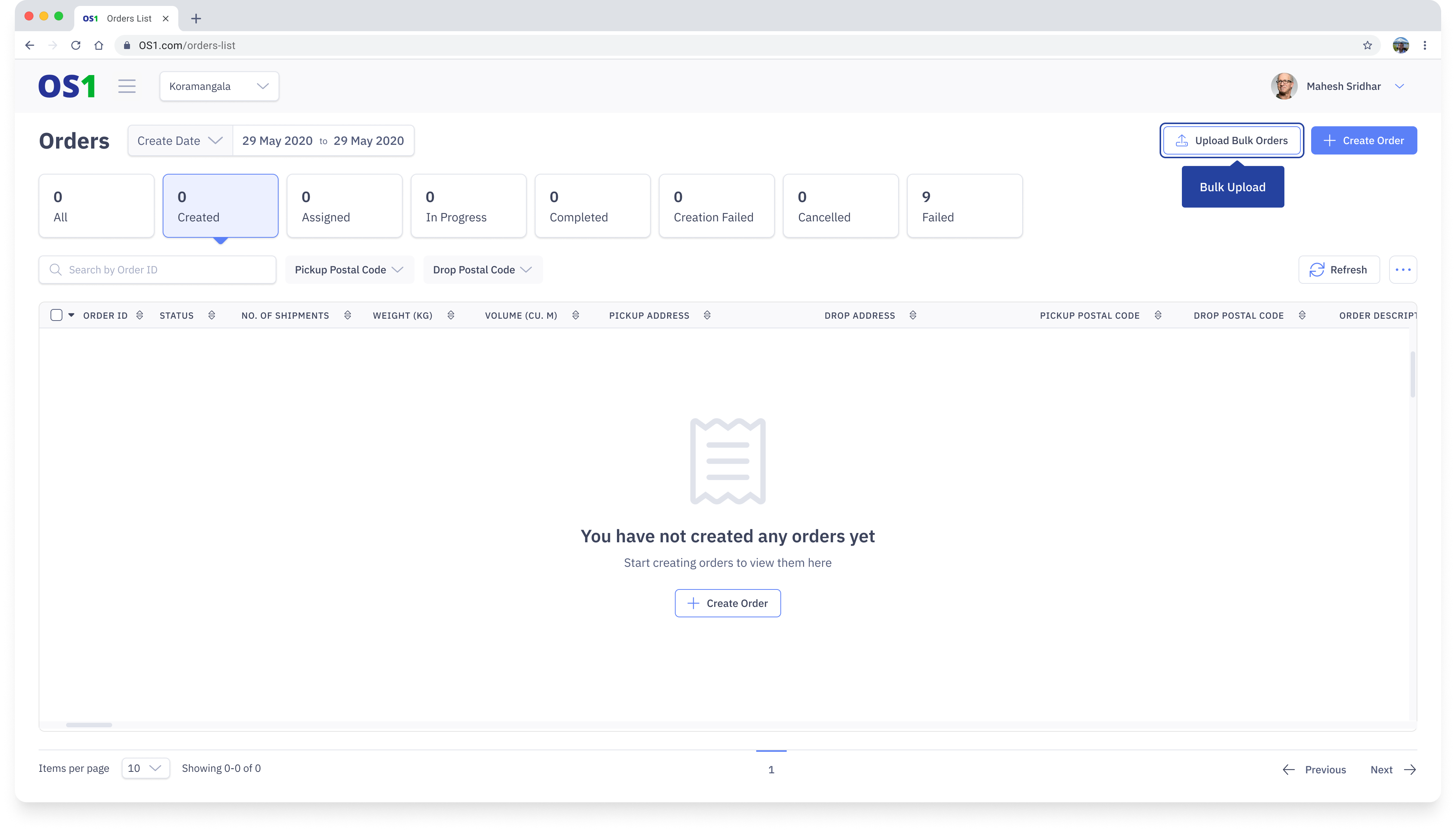 To create multiple orders on DispatchOne it is easier to use the Bulk Upload option. To use this, navigate to the Orders page and click on the "Upload Bulk Orders" button located in the top right corner of the Order Listing page. This will open up the Bulk Upload modal from where you can create the orders.