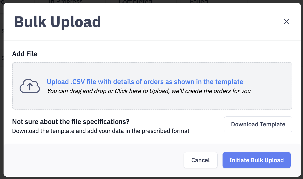 You can click on "Download Template" to download the sample .csv file that you can use to upload data. Ensure the format of the file should be the same to upload the orders.
