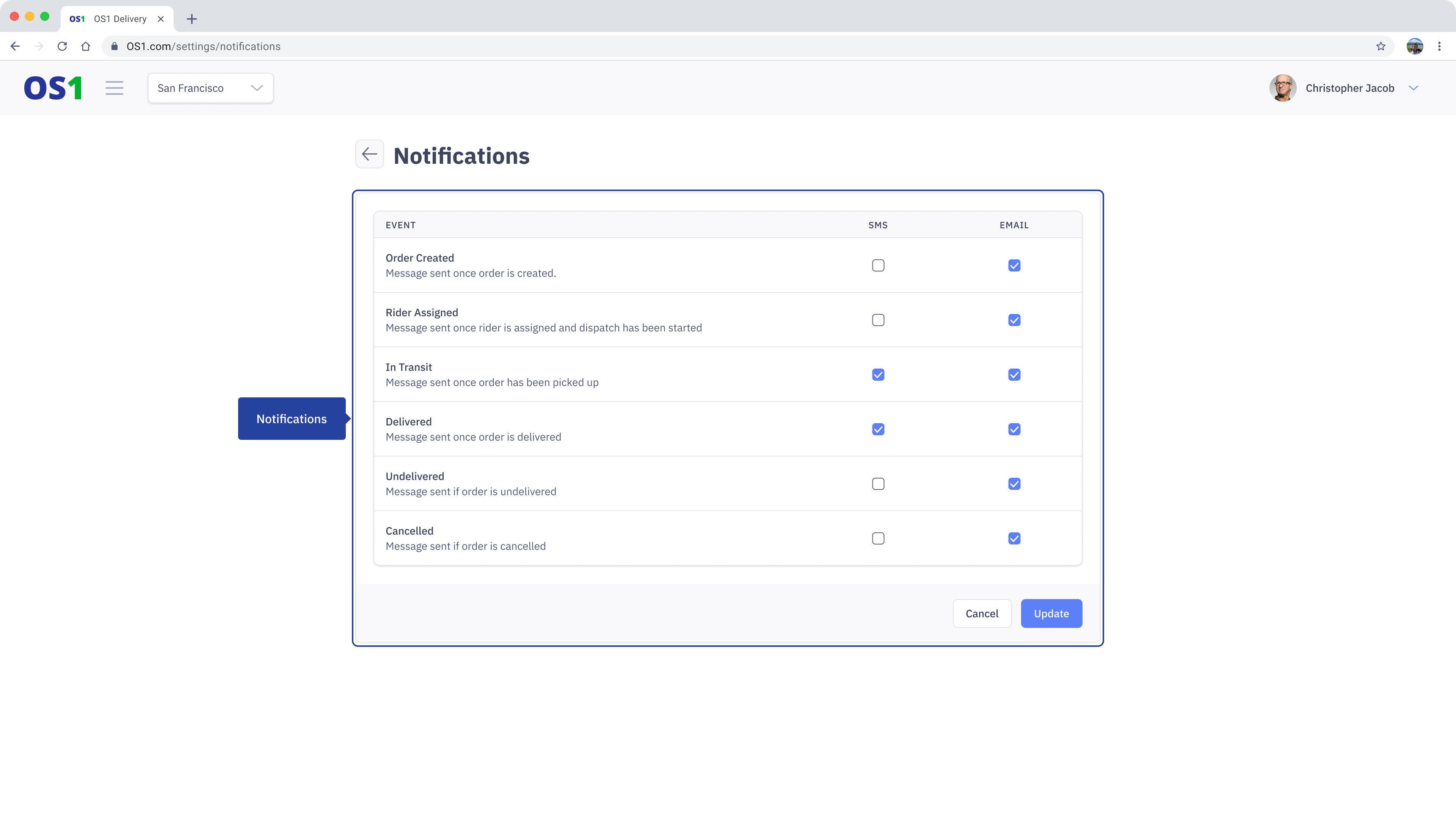On DispatchOne, you can send notifications to your end users based on the order journey. These notifications give your end users clear visibility of their orders and keep them informed. DispatchOne gives you the ability to decide for which order events you want to send and for which you don't want to send.
