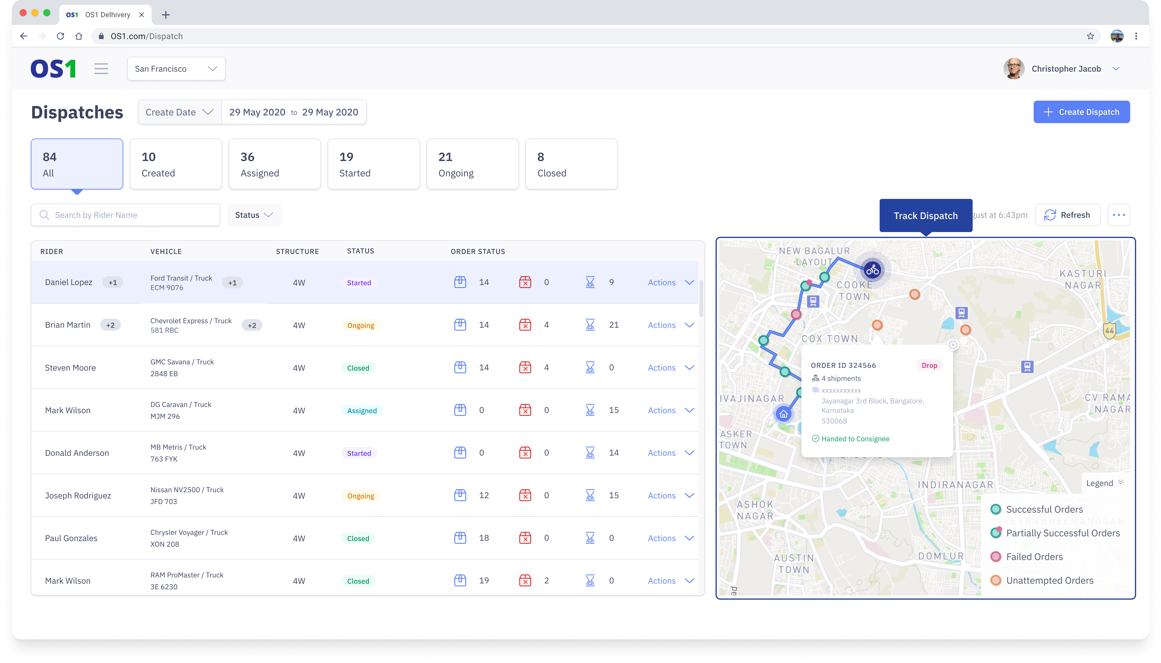 Once the dispatches are assigned and started, you can track all your dispatches and check the status of each order within the dispatch from a single place. The Dispatch Listing page has the required details for you to track your dispatches.